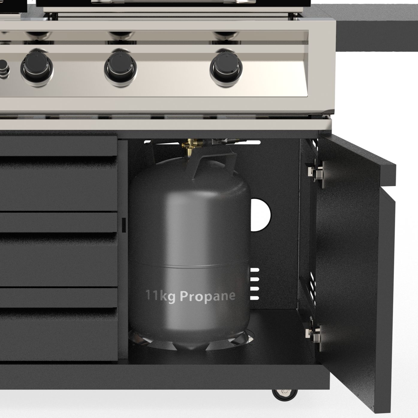 Efficient Integrated Storage: Multiple drawers and cabinet doors for easy organization of gas tanks, tools, and accessories.