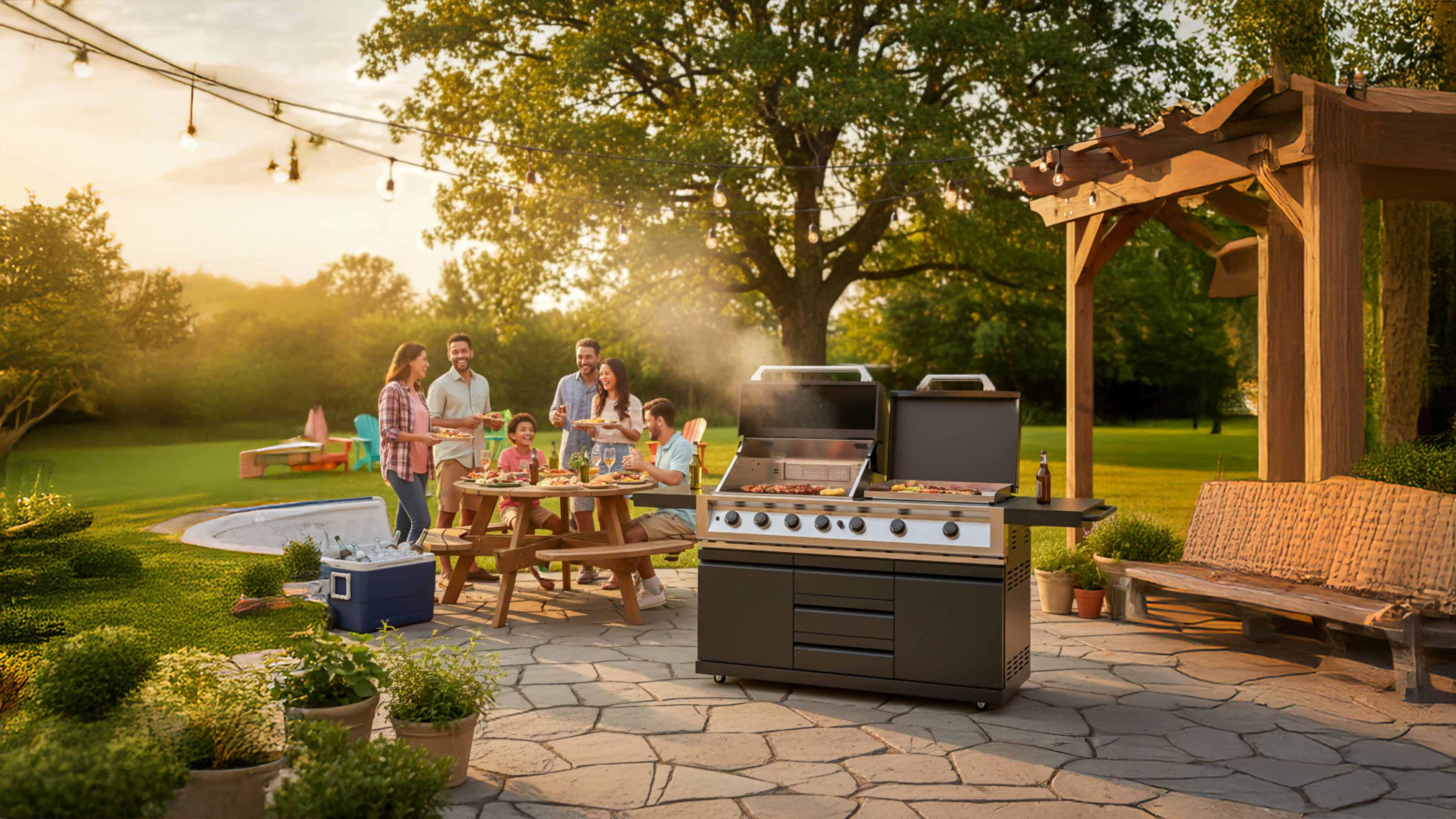For added utility, the unit includes practical workspaces on both sides, one of which appears to be a side burner or flat-top cooking area, offering extra prep space and cooking versatility. The cabinet base provides rich storage space, including drawers and a door cabinet, perfect for neatly tucking away gas tanks, tools, and accessories to keep your outdoor area tidy.